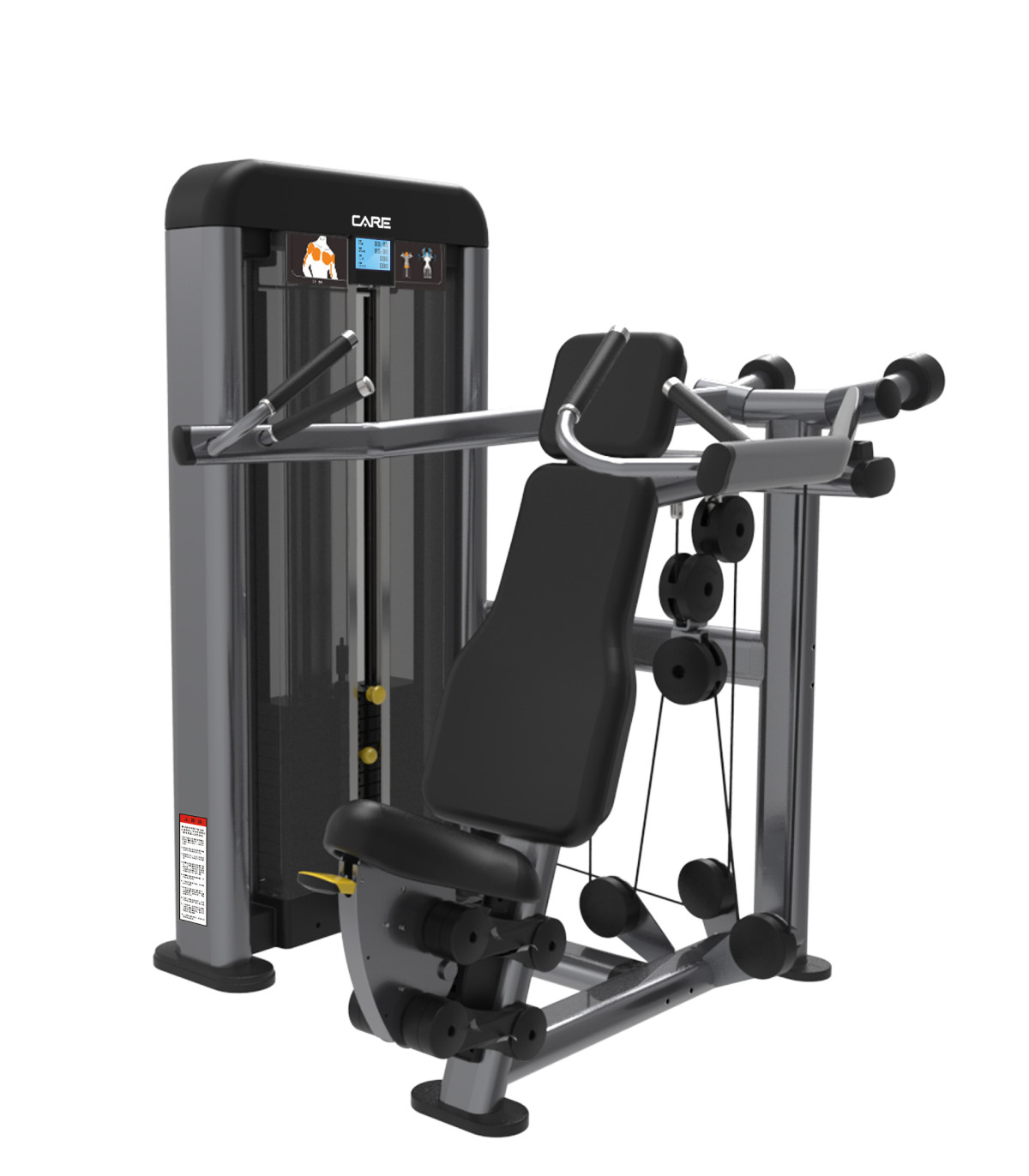 Om de voordelen te maximaliseren en veiligheid te garanderen, is het belangrijk om de juiste vorm aan te nemen, te beginnen met een geschikt gewicht en geleidelijk te vorderen. De CARE premium line deltoid press is bedoeld voor professioneel gebruik. Het gebruik ervan wordt aanbevolen onder toezicht van een fitness- of gezondheidsprofessional die u kan begeleiden en ondersteunen volgens uw doelen.