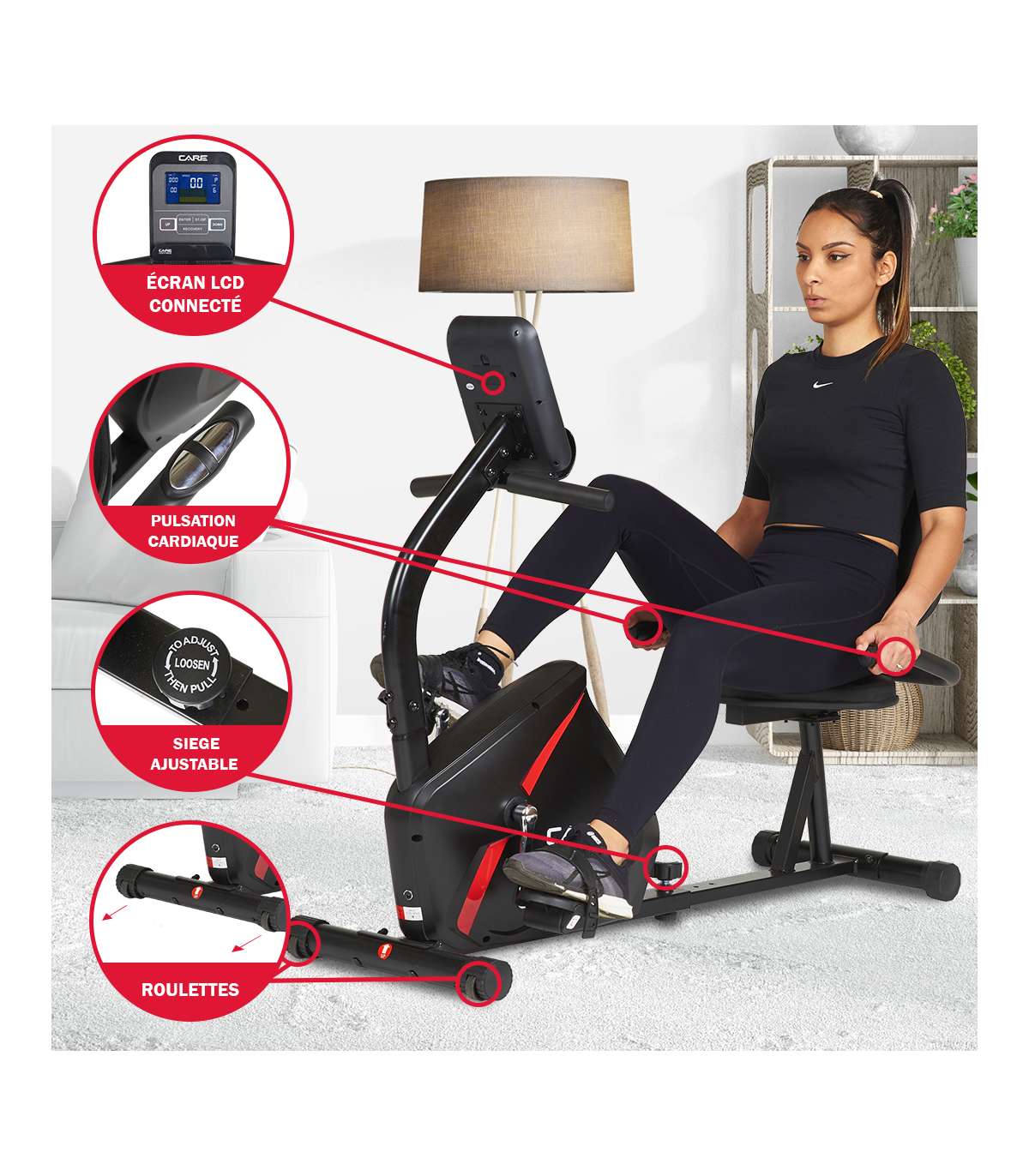 Deze semi-ligfiets is geschikt voor zowel cardiosessies als revalidatie. Met zijn vliegwielmassa biedt hij een groot pedaalcomfort, gecombineerd met een elektromagnetisch weerstandssysteem instelbaar in 16 niveaus en een teller met 20 functies.